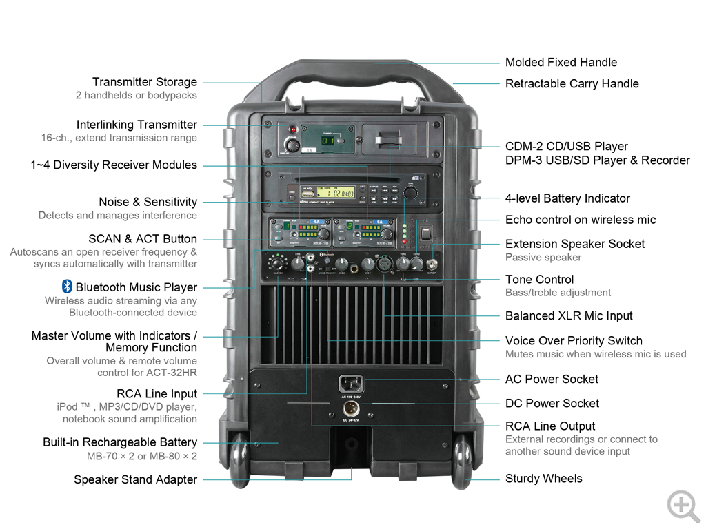 Bringing a host of impressive features and functionalities, the MA-708 is an undisputed market leader in its class. MA-708 delivers unparalleled audio performance and craftsmanship. The rugged one-piece speaker cabinet houses a high efficient class-D amplifier that drives high sensitivity two-way loudspeakers and limiter circuitry reduces distortion and increases intelligibility for guaranteed powerful and clear sound. It offers an ideal public address solution for medium to large crowds.